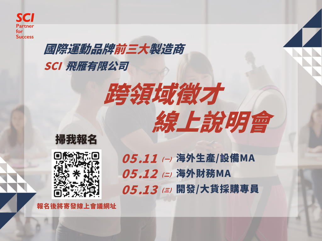 SCI 飛雁身為「國際運動品牌前三大製造商」, 正式邀請想跨入職界、大展身手的人才參加五月線上說明會!🚀
