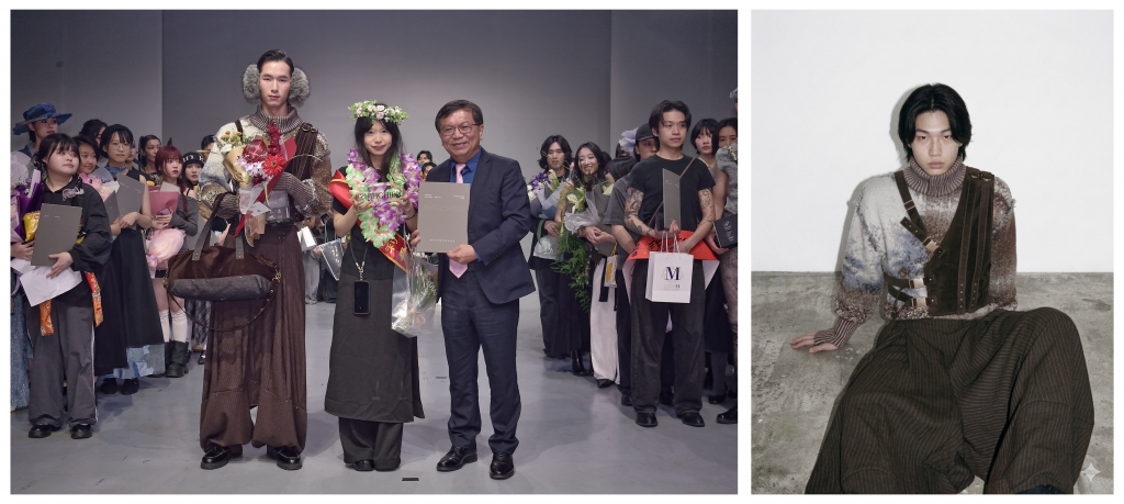 值得一提的是,本屆時裝組第二名得主連婭妘,正是目前於飛雁技術處實習的學生。其作品《線跡留形》以針織為媒介,透過外露車線與未收邊的設計語言,呈現時間痕跡與自我重構的過程;在材質運用上,結合電腦針織布、平織與丹寧等不同面料,透過軟硬對比與視覺層次,使整體輪廓更具張力與辨識度。此一成果展現學生在設計上的扎實累積與創作實力,也體現其持續探索自我風格與深化表達的努力。